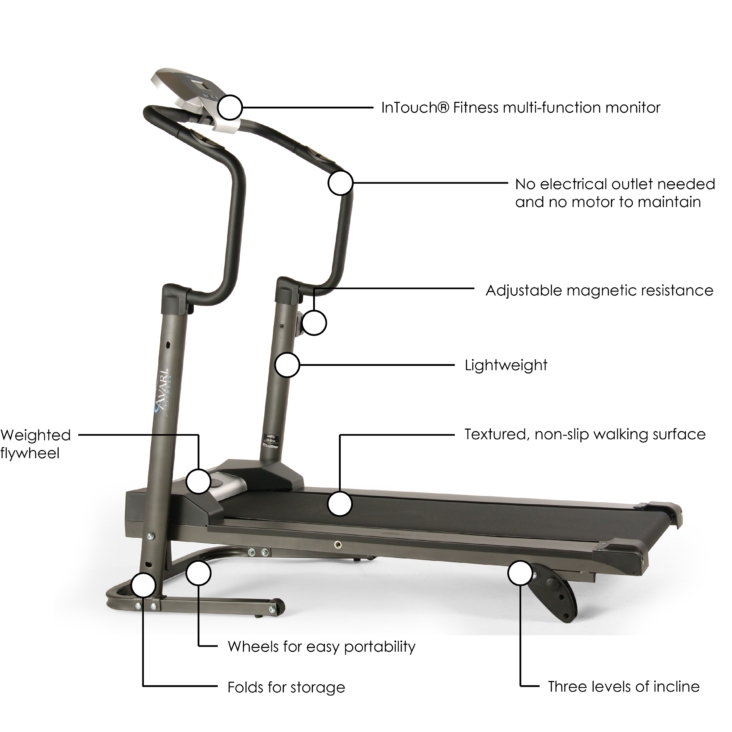 The Avari Adjustable Treadmill with magnetic resistance means you have a smooth, quiet workout. The dual flywheels also aid in making your workout as smooth as possible. There are three levels of incline to vary your workout and challenge your muscles in different ways: 8 degree for the lowest setting, 6 1/2 degree for the middle setting and 5 degree for the highest setting. For even more intensity, you can increase the resistance. But no matter how intense your workout is, the machine itself remains stable because of the stabilizer caps while you feel secure on the textured, non-slip surface.